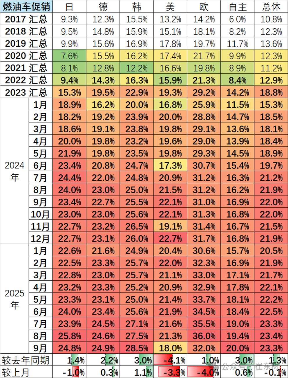 由于自主的新能源较强,2025年自主燃油车促销逐步较大,9月促销上升到18.8%,9月的促销下降也是较好的。